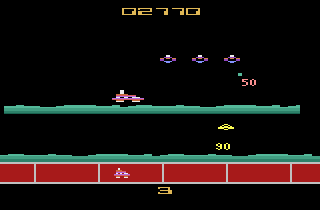 Gas Hog does introduce elements not found in Moon Patrol, such as some of the most irritatingly high-pitched and jumbled sound effects to be heard on the 2600, but it also takes some elements away. Most notably, your vehicle can't fire upward. This is inconvenient, as a group of bomb-dropping enemies continuously swoops toward and away from the top of the screen, never quite flying low enough to fall victim to your horizontal shots, even while you're jumping.